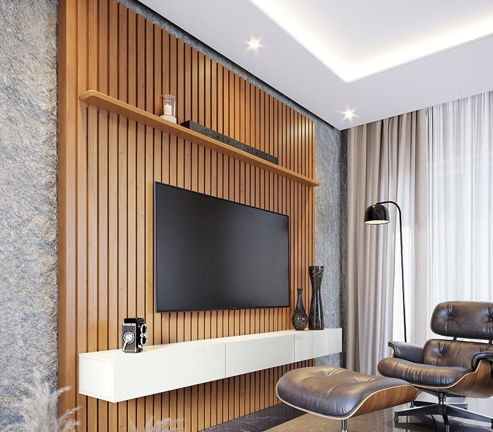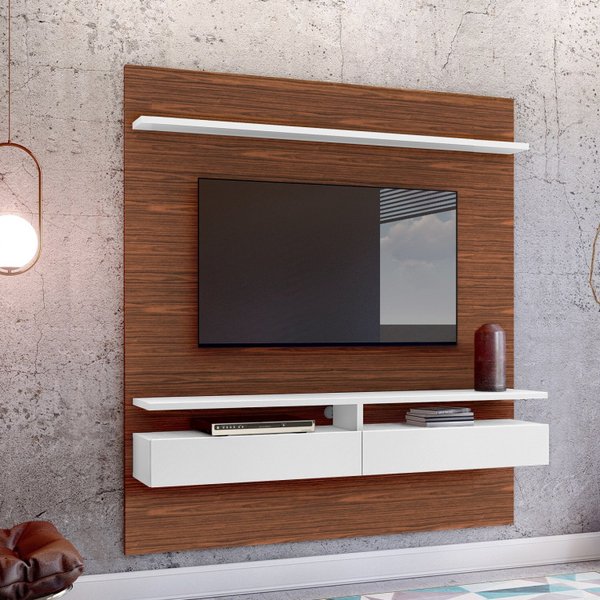O home suspenso é uma ótima escolha para salas de estar menores, pois economiza espaço no chão. Esse modelo é fixado na parede, o que cria uma sensação de amplitude no ambiente. Além disso, possibilita a instalação de prateleiras e nichos para organizar os objetos decorativos.