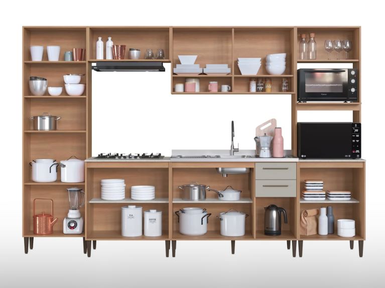 Cor: Arenas//freijó. MDP. Puxadores em alumínio. Transforme sua cozinha com a Cozinha Completa Jade, composta por 6 peças em MDP de alta qualidade. O design moderno e funcional inclui armários aéreos, balcões espaçosos, paineleiro de 4 portas e torre quente de 3 portas.